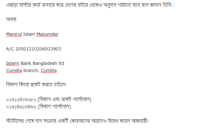 এ সময় দেশের জনপ্রিয় এই বক্তা বলেন, ‘আজ থেকে সাত দিনের মধ্যে ফান্ড কালেকশন সম্পন্ন হবে। ১৭ এপ্রিলের পর আর কোনো অনুদান গ্রহণ করা হবে না। যাকাতের টাকা এই তহবিলে দেয়া যাবে। সর্বমোট উত্তোলিত টাকা এবং খাদ্য সামগ্রী বিতরণের আপডেট আপনাদেরকে জানানো হবে ইনশাআল্লাহ।’কীভাবে অনুদান দেয়া যাবে সে বিষয়েও স্ট্যাটাসে উল্লেখ করেন আজহারী।