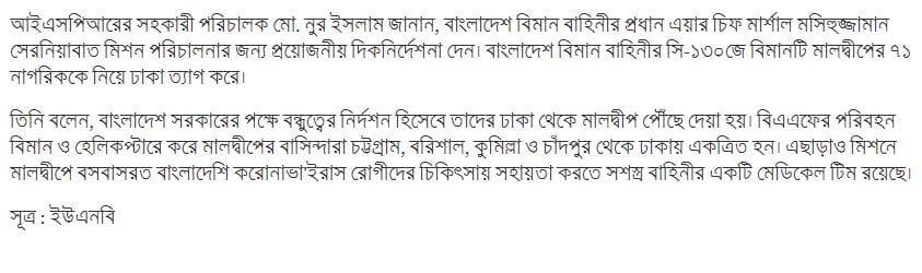 Assistant Director of ISPR. Noor Islam said that Air Chief Marshal Masihuzzaman Sarniabat, the chief of the Bangladesh Air Force, gave the necessary direction to carry out the mission. Bangladesh Air Force C-130J aircraft left Dhaka with 71 Maldives citizens.