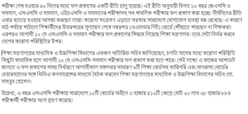 Within 60 days after the end of the experiment, a pattern of expression was introduced. According to this practice, the results of all public examinations including the JSC and equivalent, SSC and equivalent, HSC and equivalent examination have been released for the last 10 years. They are afraid to disrupt the long-held rituals this time. The government has shut down communications across the country to prevent Corona transmission. Due to this, the teachers are not able to reach the number sheet (OMR sheet) board after evaluating the answer sheets of the students sent to the field level. Even then, the Ministry of Education has decided to publish the results of SSC and equivalent examinations on May 10. However, it will depend on the corona situation in the country.
