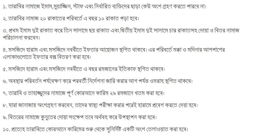 করোনাভা’ইরাসের কারণে উদ্ভূত আশঙ্কাজনক পরিস্থিতির কারণে সৌদি আরবের প্রধান দুই মসজিদ তথা মসজিদে হারাম এবং মসজিদে নববীতে আসন্ন রমজানে এ বছর ১০ রাকাত তারাবি আদায়ের সিদ্ধান্ত নেয়া হয়েছে।সোমবার রাতে মসজিদে হারামের প্রধান ইমাম ও হারামাইন শরীফাইনের প্রেসিডেন্সির প্রধান শায়েখ আবদুর রহমান আস সুদাইস আসন্ন রমজানে তারাবি ও অন্যান্য বিষয়ে গৃহীত সিদ্ধান্তের কথা জানিয়ে দেন।