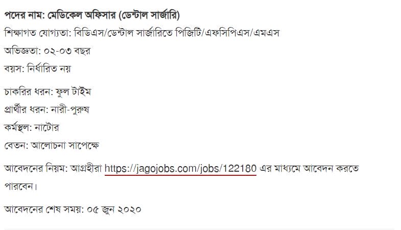 Manpower will be recruited for the post of ‘Medical Officer (Dental Surgery)’ at Amjad Khan Chowdhury Memorial Hospital of the multinational industrial organization Pran-RFL Group. Those interested can apply till June 05.