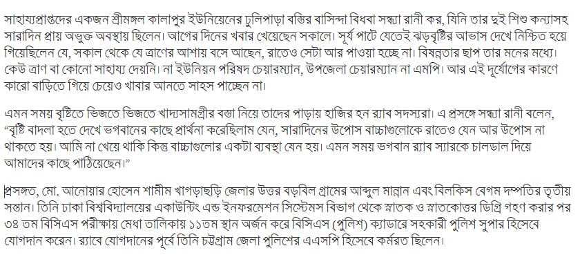 The RAB officer rushed to the victims in the aftermath of the storm. Although he had no road to drive, he and his fellow RAB members carried a sack of relief in two hands, reaching the exposed people with rain-soaked muddy bees and reaching a total of 15 families with essential supplies including rice, pulses, oil. During this period, he assured the families of the victims that they would receive government assistance.