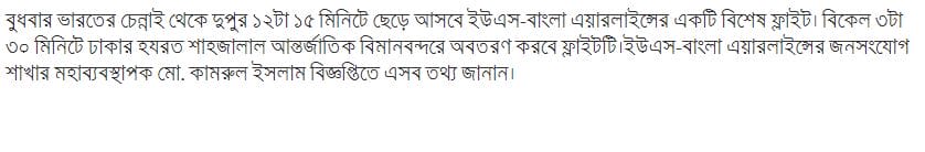 A special US-Bangla Airlines flight will depart from Chennai, India at 12:15 pm on Wednesday. The flight will depart at Hazrat Shahjalal International Airport at 3:30 pm.