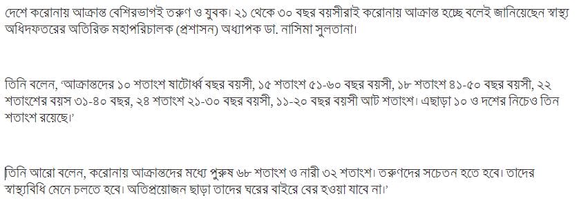 Most of the affected people in the country are young people. Additional Director General (Administration) of the Department of Health, Prof. Dr. said that only 21 to 30 year olds are affected by corona. Nasima Sultana.