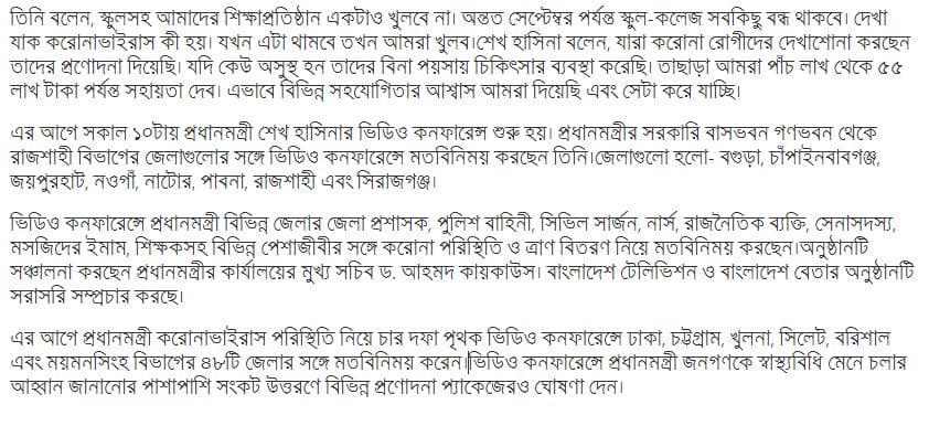 Earlier, the Prime Minister exchanged views with 48 districts of Dhaka, Chittagong, Khulna, Sylhet, Barisal and Mymensingh divisions in a four-point separate video conference on the coronavi’rus situation.