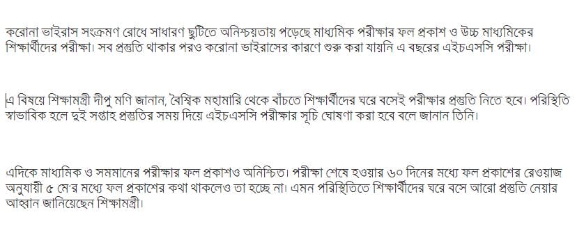 In this regard, Education Minister Dipu Moni said, in order to survive the global epidemic, students have to prepare for exams at home. If the situation is normal, the schedule of HSC exams will be announced with two weeks of preparation time, he said.