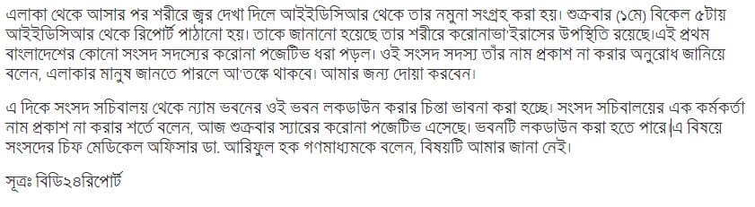 If he came down with fever after coming from the area, his samples were collected from IEDCR. The report was sent from IEDCR at 5pm on Friday (May 1). He was informed that Coronav’irus was present in his body. Asked not to be named, the lawmaker said people in the area would be shocked if they found out. Pray for me.