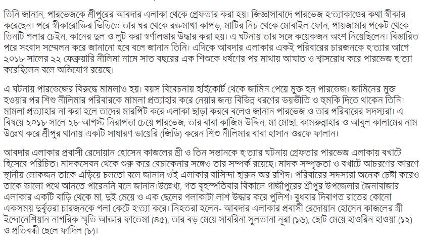 He said Parvez was arrested from Abdar area of Sreepur. Under interrogation, Parvez confessed to the m’urder. On the basis of the confession, blood stained clothes, mobile phone from underground, three necklaces, earrings and looted gold ornaments were recovered from his house. A few people took part in the incident with him. Details will be announced later at a press conference, he said. Meanwhile, before killing four members of the same family in Abdar area, Parvez allegedly killed a seven-year-old child named Neelima on February 22, 2018 by hitting her on the head and suffocating her.