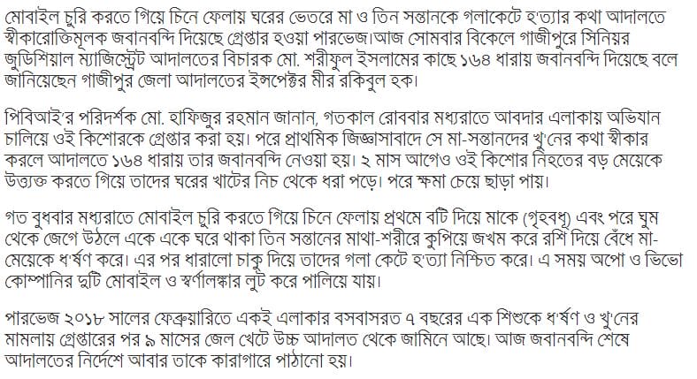 Ar’rested Parvez has given a confessional statement to the court that his mother and three children were strangled inside the house for stealing a mobile phone. Senior Judicial Magistrate’s Court Judge Md. Gazipur on Monday afternoon. Gazipur district court inspector Mir Rakibul Haque said Shariful Islam had given a statement under section 164.