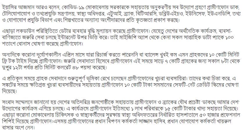 On the other hand, Grameenphone is giving 100 million minutes of free talk time to the customers who could not recharge or had very little balance in April during the Corona disaster. As an emergency service provider, Grameenphone currently charges 48 paise per minute for 7 and a half crore subscribers from 8 am to 12 noon.