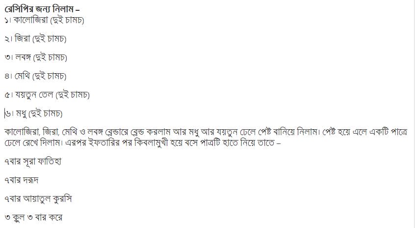 সকাল বিকালের নিরাপত্তার দুআগুলো পড়ে তাতে ফুঁক দিলাম। এরপর এই দু’আটি “ওয়া ইযা মারিদ্বতু ফাহুয়া ইয়াশফীন (আর আমি যখন অসুস্থ হই, তিনিই আমাকে সুস্থ করেন।)” পড়ে চামচে তুলে অল্পে অল্প করে জিহবাতে নিয়ে আস্তে আস্তে গিলতে লাগলাম। এভাবে দুই চামচ খেলাম।