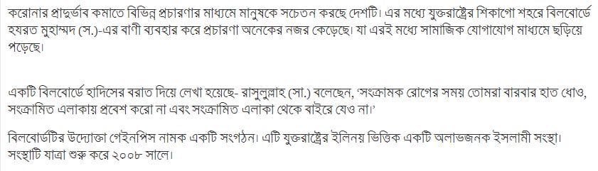 According to a Hadith in a billboard, the Prophet (peace be upon him) said, “In infectious diseases, wash your hands frequently, do not enter the infected area and do not go out of the infected area.”Billboard is an entrepreneur named Gainpiece. It is a Illinois-based non-profit Islamic organization in the United States. The company began its journey in 2008.