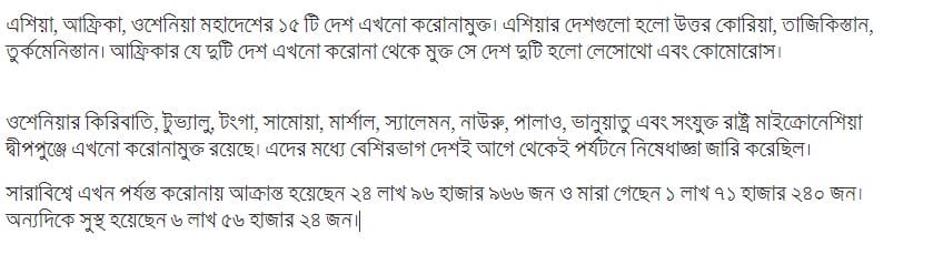 চীনের উহান থেকে সারাবিশ্বে ছড়িয়ে পড়েছে প্রা’ণঘাতী করোনাভা’ইরাস। বিশ্বের ২১০টির বেশি দেশে ছড়িয়ে পড়েছে এই প্রা’ণঘা’তী ভা’ইরাস। তবে এখনো বিশ্বে কয়েকটি দেশ আছে যেখানো করোনা রোগী শনাক্ত হয়নি।