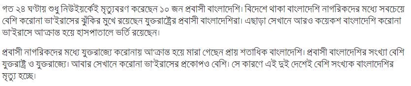 এছাড়াও করোনা ভা’ইরাসে আ’ক্রান্ত হয়ে সৌদি আরবে ১৭, কানাডায় ৬ জন, ইতালিতে ৬, স্পেনে ৫, কাতারে ৪, সংযুক্ত আরব আমিরাতে ১, লিবিয়ায় ১, সুইডেনে ১, গাম্বিয়ায় ১ ও কেনিয়ায় ১ বাংলাদেশির মৃত্যু হয়েছে।সিঙ্গাপুরে প্রথম বাংলাদেশি প্রবাসীরা করোনা ভা’ইরাসে আ’ক্রান্ত হন। সেখানে এ পর্যন্ত প্রায় তিন হাজার বাংলাদেশি নাগরিক করোনায় আ’ক্রান্ত হয়েছেন। তবে কোনো বাংলাদেশির মৃত্যুর খবর পাওয়া যায়নি।