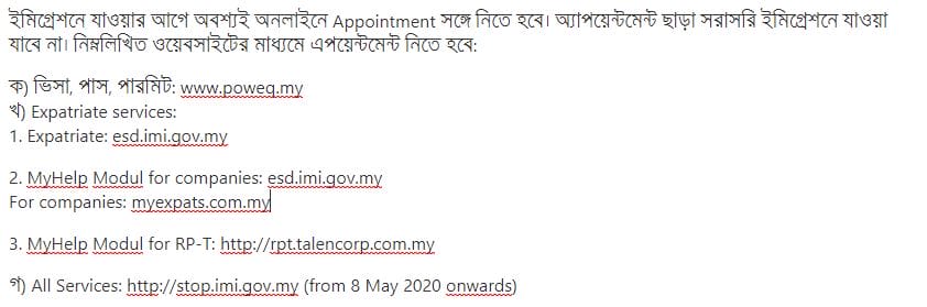 মালয়েশিয়া প্রবাসী বাংলাদেশিদের জন্য দূতাবাস থেকে বিজ্ঞপ্তি জারি করা হয়েছে। তাতে বলা হয়েছে, দেশটিতে মুভমেন্ট কন্ট্রোল অর্ডার সম্পন্নের পর সকল ইমিগ্রেশন অফিসে ভিসা সার্ভিস চালু করার সিদ্ধান্ত নেয়া হয়েছে।মালয়েশিয়া ইমিগ্রেশন স্বাস্থ্য ও নিরাপত্তা নিশ্চিত করার জন্য কঠোরভাবে অ্যাপয়েন্টমেন্ট পদ্ধতি এবং জনসমাগম নিয়ন্ত্রণ (strict appointment system and crowd control) করবে। শুধু অ্যাপয়েন্টমেন্টের মাধ্যমে সামাজিক দূরত্ব বজায় রেখে এবং করোনা প্রতিরোধের ব্যাবস্থা গ্রহণ করে সার্ভিস দেবে।